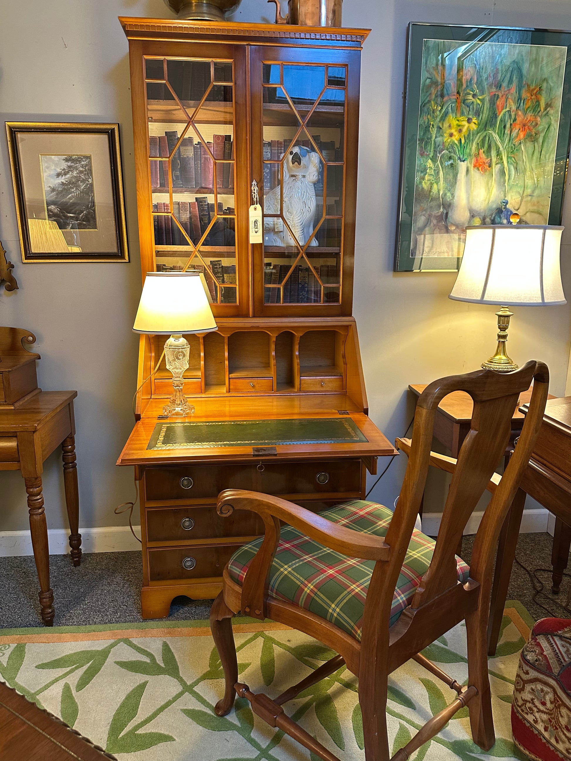 English Yew Wood Two Part Secretary Desk with Hand Tooled And Stenciled Green Leather Writing Surface. (Local Pickup only)