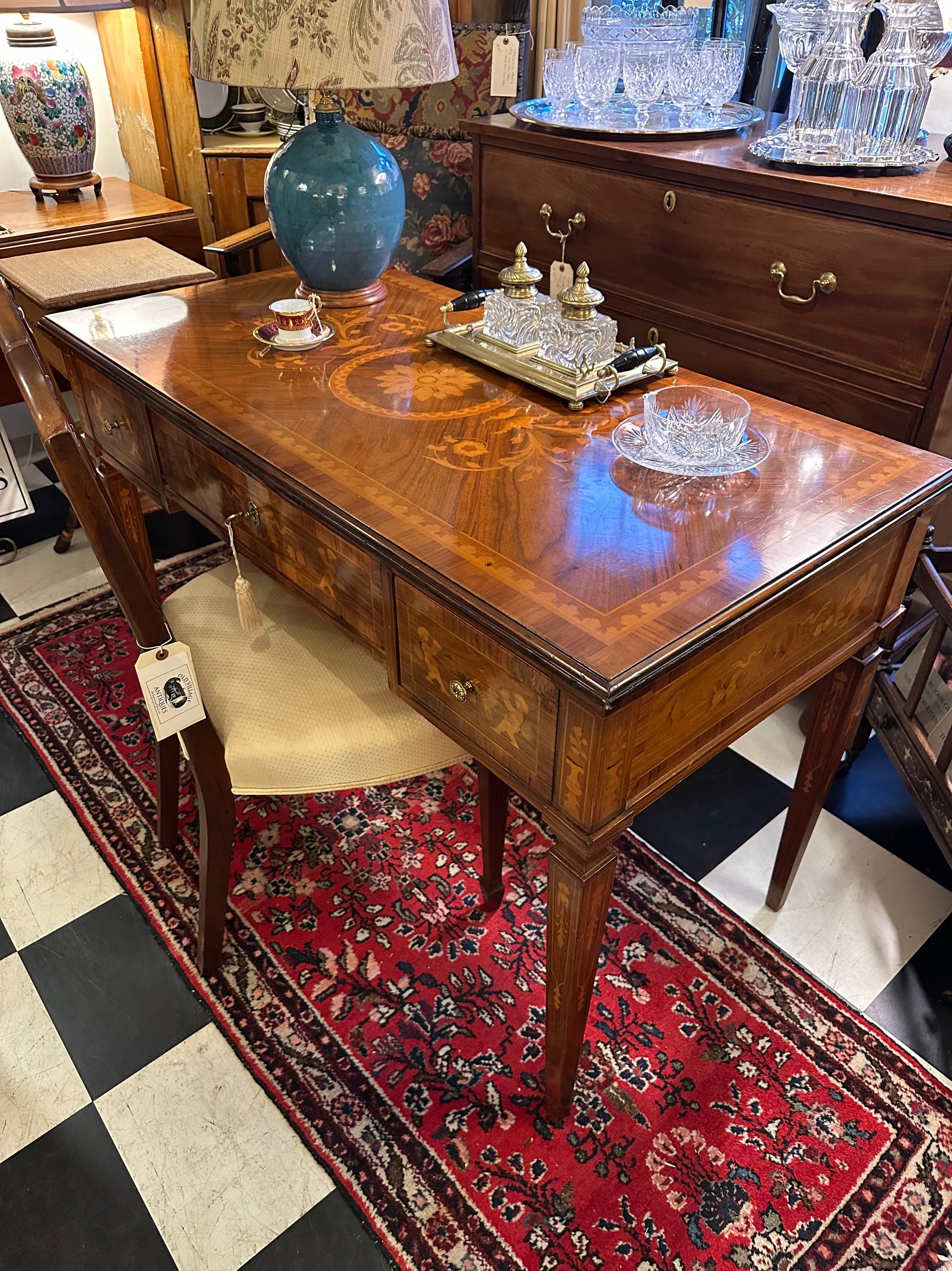 47 1/4” Long, 23 1/2” deep by 31 1/4” tall. Italian inlaid Three Drawer Writing Desk on Tapered Legs. LOCAL PICKUP ONLY - AVON, CT